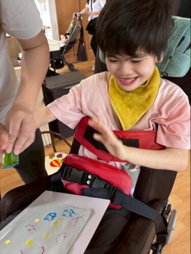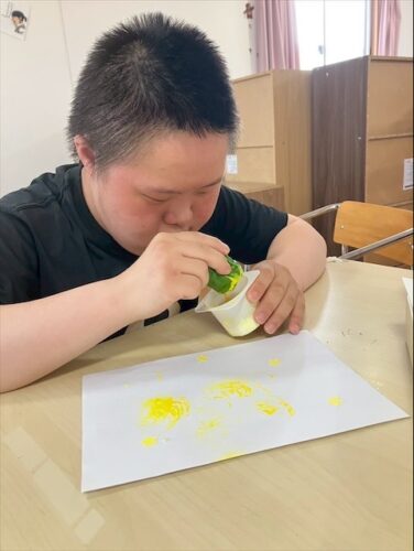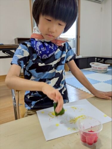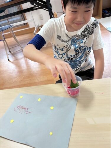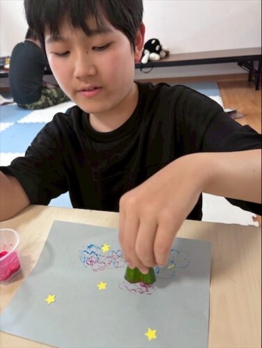 今日は星🌟の形の画用紙に天の川を作る活動として野菜スタンプをしました。