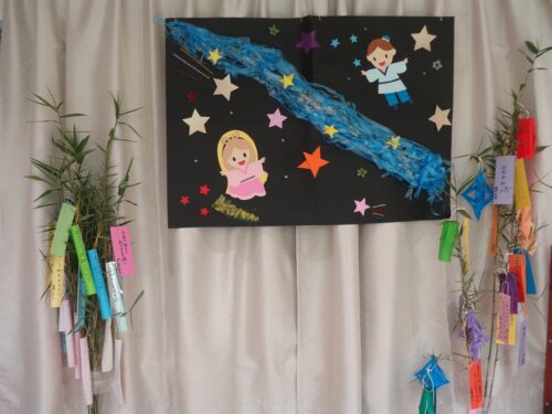 ご入居者様に、短冊への願い事と飾り付けの作成をお手伝いいただきました。七夕飾り