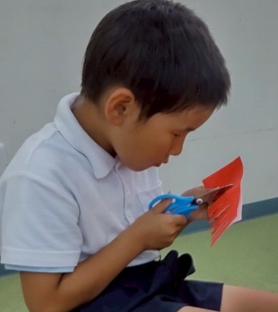 折り紙を等間隔に切ります。真剣な表情です😠✂️ のりで貼ったり、折り曲げたりしたら…… 完成✨短冊に思い思いの願い事も書きました。とてもきれいに飾りつけてくれました。みんなの願い事、叶うかな☺️