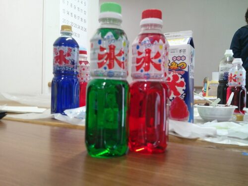 かき氷の味はブルーハワイ、メロンとイチゴ味です。その上に甘くておいしい練乳をかけています。おいしそうに食べていますね(#^.^#)