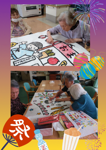 さわやか海響館 7月の壁紙作成🎶 2025-07-08 2025-07-08 毎月恒例の各フロアの壁紙を 作成しました✨ 今月のテーマは 夏祭り❗🤩❗ & 夏の風物詩❗🎉 ラムネの瓶が涼しさを演出していますね✨😊 完成後は記念撮影✌️✨ 大作になりました😆✨ 🐸楠田🐸