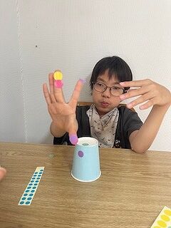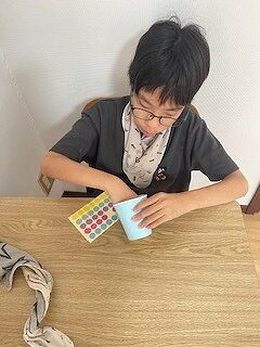 紙コップに丸のシールを貼っていきます〇