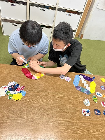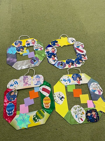 準備されたリースの土台にイラストやシール、星の飾りなど思い思いに貼って行きました😄