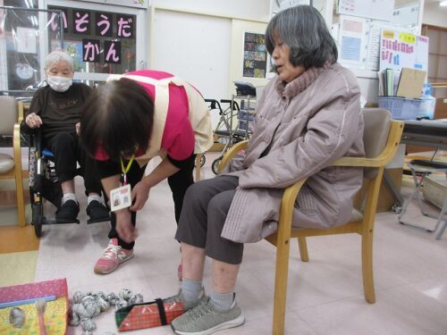 新聞紙を丸めたボールをすくって箱に入れていきます❗