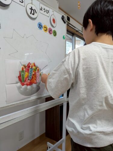 ホワイトボードにケーキのパズルを貼り付け完成させてもらい