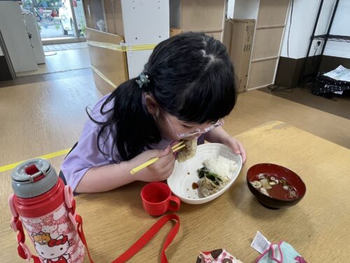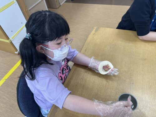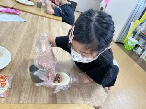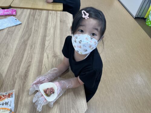 「見て!上手にお肉のせれたよ!」