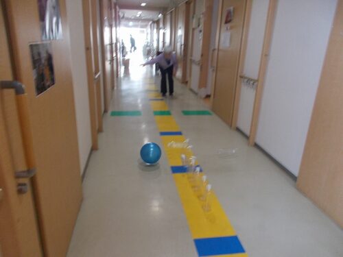 さわやかはーとらいふ西京極 ☆2Fのボール遊び☆ 2025-07-11 2025-07-11 6月末より連日猛暑日が続いていますが、2Fのレクリエーションとしてこの日は、廊下でペットボトルをピンに見立てたボーリングと、卓上でのキャッチボールを楽しんで頂きました。体に負担にならない程度の運動で皆様の活力アップです。