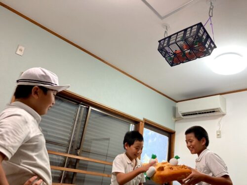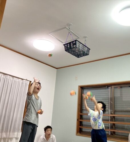 ぶら下がったカゴめがけて、玉(今回はにんじんとだいこん)を投げいれていきました👍