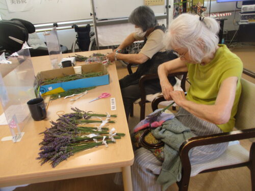 さわやかひだか館 ラベンダーの香り 2025-07-17 2025-07-14 こんにちは‼ひだか館斉藤です😐 今回は❓ 女性入居者様の様子をお送りします👩👩👩 ラベンダーを纏めて縛って頂いてます🎀 食堂で行っていますが...。 とても‼いい香りです(^^♪ いつもいつもご協力✋✋✋ ありがとうございます💖💖💖💖