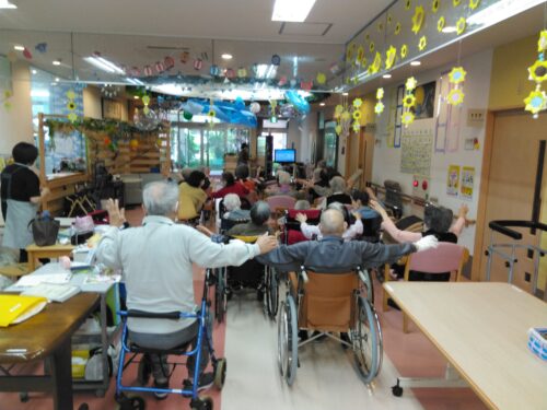 朝のあいさつ、ラジオ体操、発声練習、最後にカラオケの順番で元気よく行きましょう!!