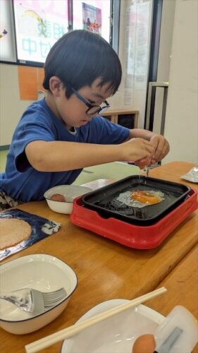 黄身を崩して焼き、えびせんの上に乗せます🍳