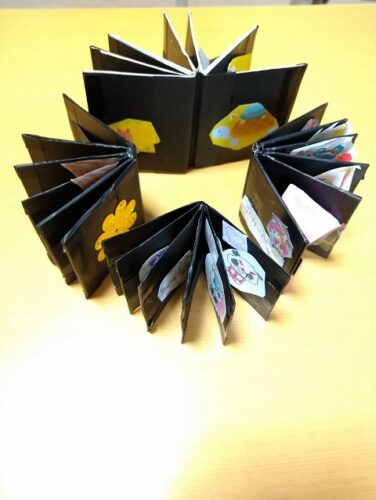 ベース色は、夜の花火やホラーを意識した「黒」で、児童たちのそれぞれの好きな世界で、独自のストーリーを考え本に貼ってもらいました。