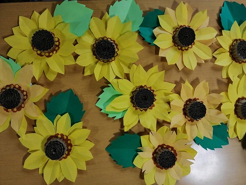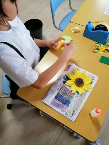 集団活動は夏の室内を彩る「ひまわり」を作りました。
