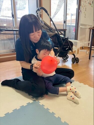 しりとりでは皆んなで円になって、風船を順番に回しながら行いました。