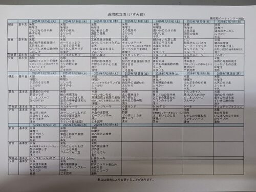 さわやかいずみ館 献立表 さわやかいずみ館 2025-07-15 2025-07-17 こんにちは😀 7月15日から31日の 献立表です🍨 予定表 16日(水) フラワーアレンジメント教室 25日(金) 入居記念日 26日(土) 訪問理美容 27日(日) 誕生会 ※あくまで予定ですので、変更になる場合がございます。