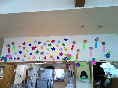 フロアのお花を眺めて、ホッとします。 見上げると、キッチン上の壁にキラキラの星と風鈴があります。