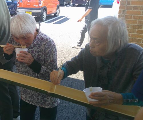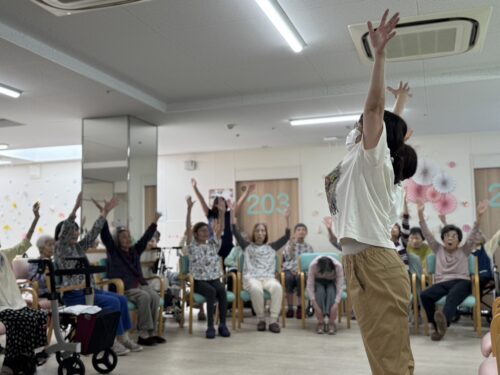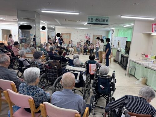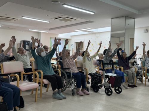 2階、3階、4階、5階の入居者様が集まり真似をして「これでいいのかなぁ」とやって見せてくださっていました