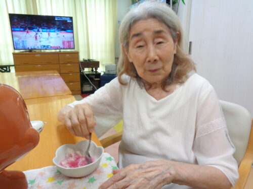 そんな中でも入居者の皆様に涼を感じていただく為、今日はかき氷を作ってみました♪