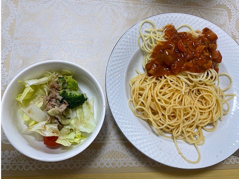 二種類のパスタと自分の作ったドレッシングをかけて食べるサラダは美味しいですね✨