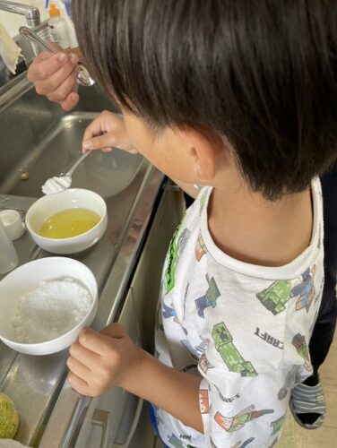 電卓を使って、頭を使いながら分量を量っている子どもたち!!普段学んでいる算数を活かせる活動となりました!!