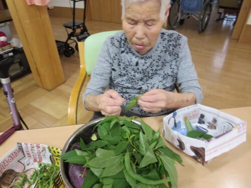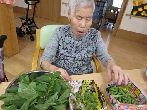 さわやかグループホーム なすしおばら すいせんユニットの様子 2025-07-24 2025-07-21 畑で収穫したインゲンのすじを取って下さってます。 畑を耕すところから頑張って下さった大切なお野菜です(*^_^*) 採りたてのインゲン、柔らかくて香りがあってとても美味しかったです。 ありがとうございました(*^_^*)