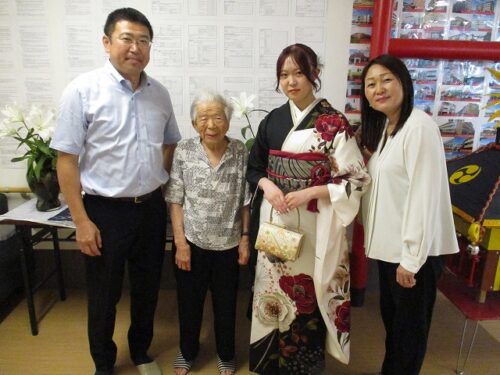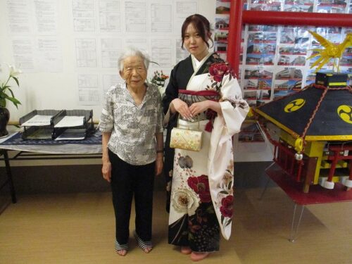 ご入居者様も職員も、すごくきれいな振袖とひ孫様に