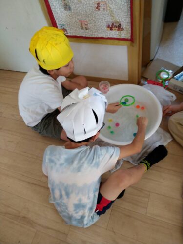 そうめん流し風のだがしながしやすいか割り、ふうせんはこびやヨーヨー釣りを楽しみました☆
