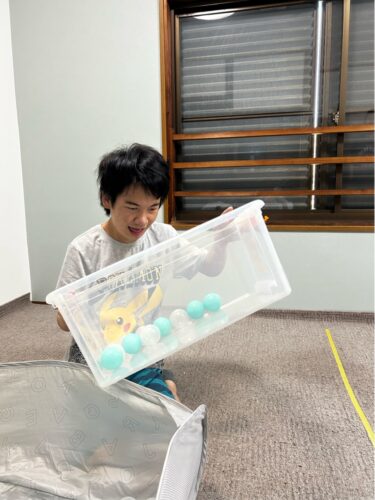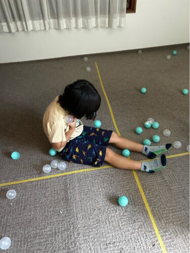 「いくよー!」と声をかけてコミュニケーションをとりながらキャッチボールをしたり、ボールを水に見立ててボールプールでかんかくあそびをしたり、自分たちで考えたルールで新しいボール遊びをしたり…様々な遊び方で楽しんでいました!