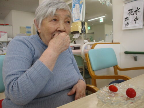 当施設の外の花壇で栽培していたミニトマトを収穫し、ご入居者様に試食していただきました🍅