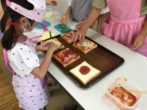 最後はピザトーストも作りました!食パンにぴぃたぁぱんオリジナルのピザソースを塗り、チーズやピーマンをトッピング