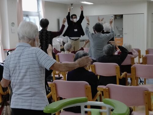 暑い中ですが、入居者の皆さまは元気に活力朝礼に参加なさっています😊