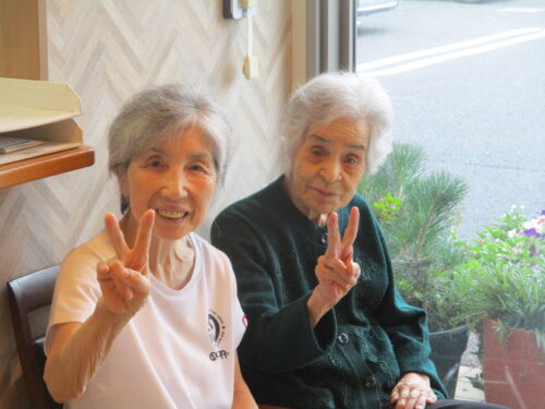 朝から🌄玄関先で女性入居者様がお二人でお話しています👧💛👧
