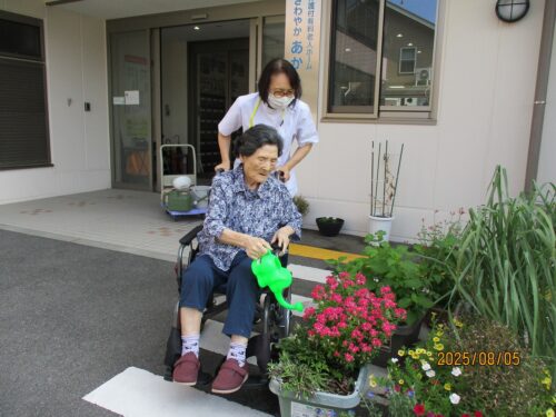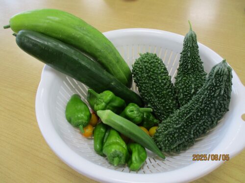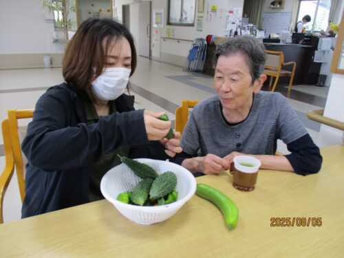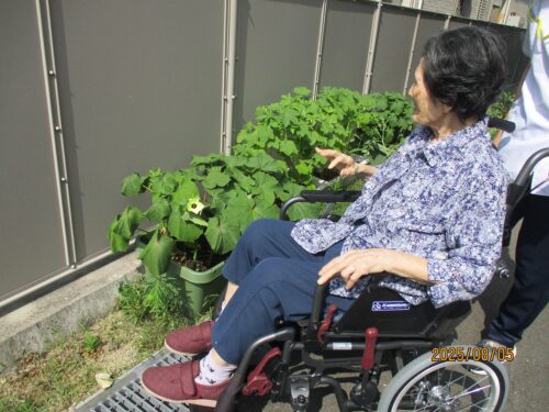 暑さにも負けず、毎朝、入居者様が水やりと野菜の収穫を