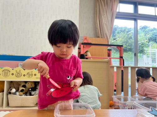 真剣な表情で、色水を見つめるRちゃん🍑