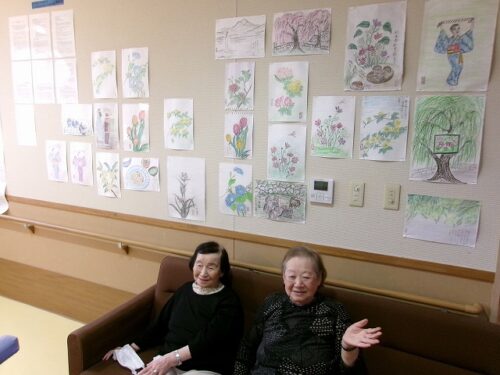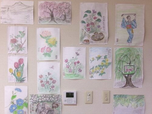 こちらでは、利用者様ご自身が作成し飾られた絵をご覧になっていました😘
