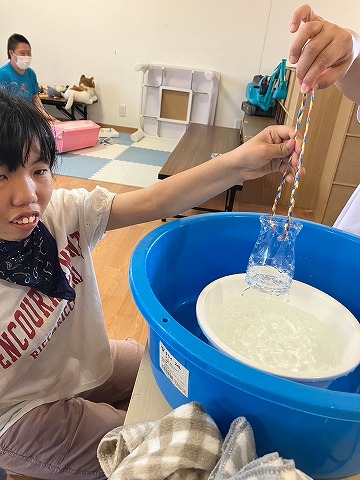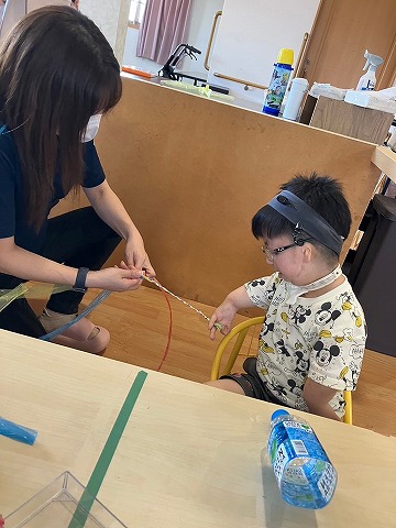 さわやか愛の家 さいだいじ館 ペットボトルジョウロ💦 2024-07-26 2024-07-26 暑い中でも涼しく遊べるペットボトルジョウロを作りました! キリで穴を開けて… 紐も手づくり♪ 水が上手に出る確認! 可愛い作品ができました(#^.^#) さわやか愛の家さいだいじ館