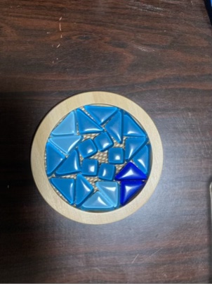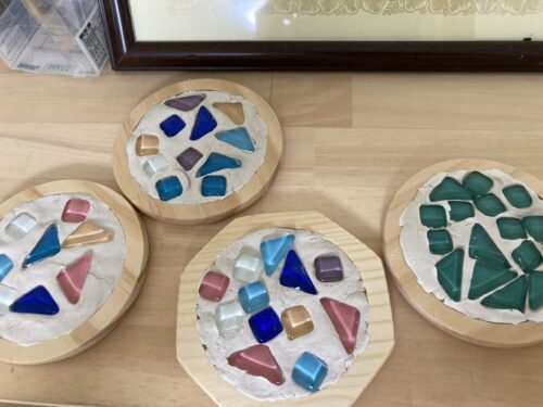 木製コースターに粘土を詰め、ガラスのタイルを貼り付けていきます。