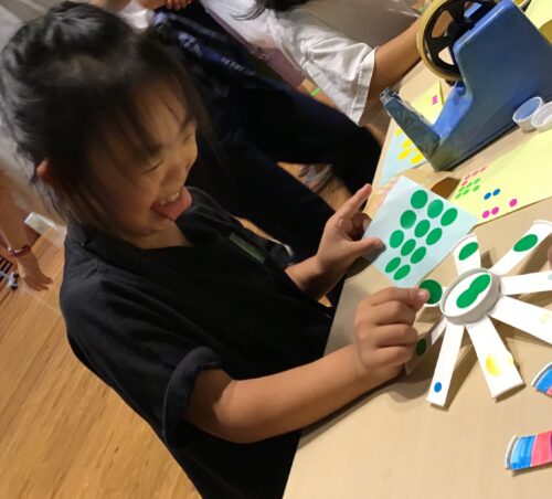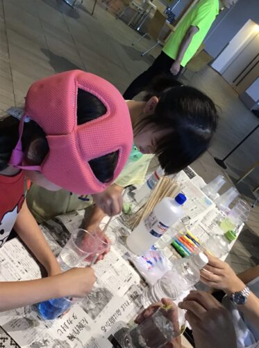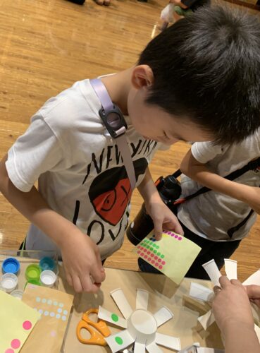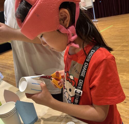 折り紙飛行機と紙コップコマの説明を真剣に聞いています✨
