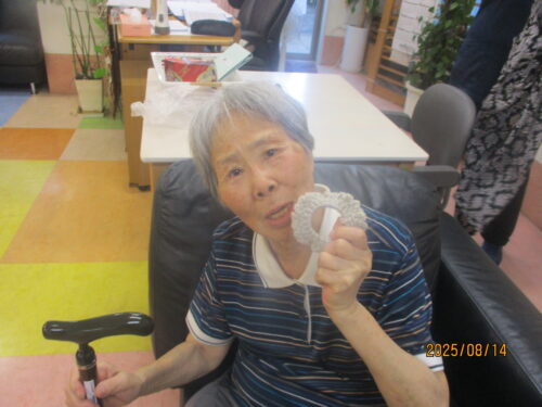 今日はご利用者様が、ヘアゴムに編み物をして世界に一つだけの、シュシュを作って下さいました(*´ω`*)