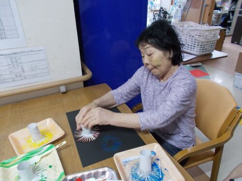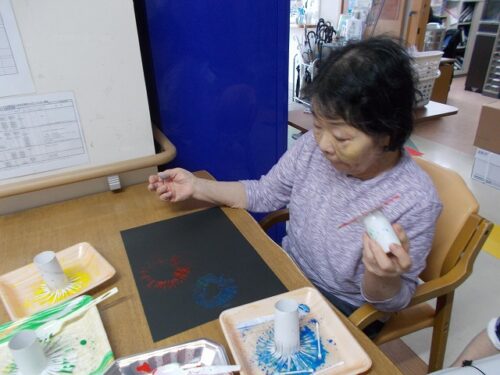 さわやかはーとらいふ西京極 ☆2Fでのレクリエーション☆ 2025-08-16 2025-09-15 今日のレクリエーションは、トイレットペーパーに細かい切れ込みを入れ、それに絵具を付けて黒い画用紙に押し付けて、夜空に舞う花火を作って頂きました。夜空の花火は季節としてまさにピッタリ。職員さんのアイデアが光ります。