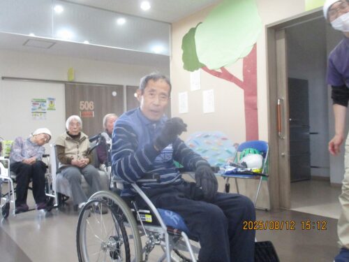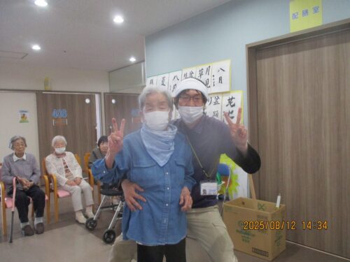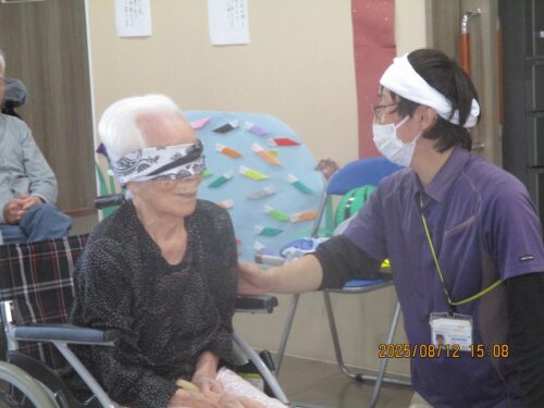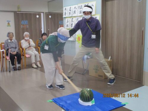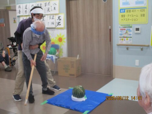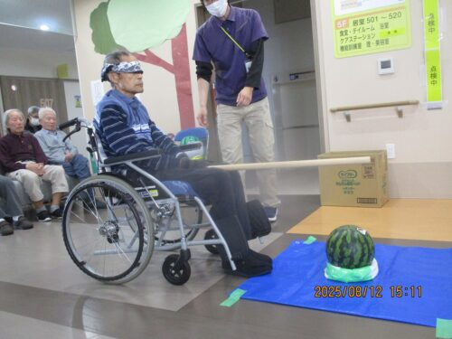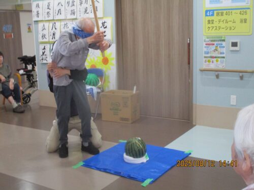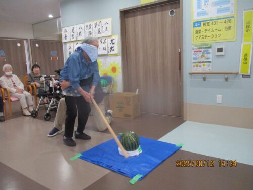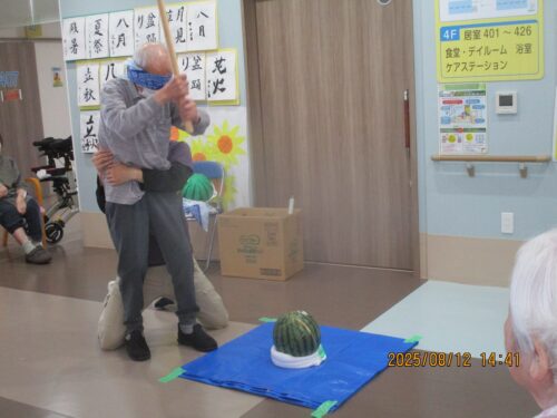 スイカ割りのほうですが、位置がずれて当たらなかった方もおられましたが、最後には、無事スイカにひびを入れることができました。