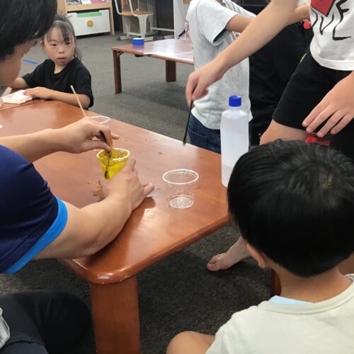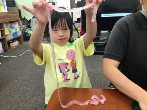 水のりと、ほう砂と、水を入れ、ぷにぷにスライムになるよう配合をしました!!