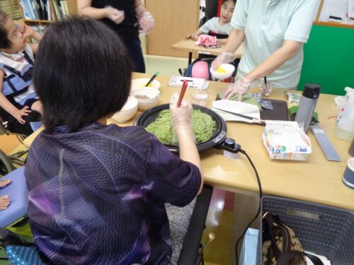 さわやか愛の家 むなかた弐番館(介護) かわらそば✨ 2025-08-21 2025-08-18 こんにちは✨ さわやか愛の家むなかた弐番館 生活介護 古賀です★ 先日、放課後デイの皆さんからお誘いを受け 合同で「かわらそば」を作りました🍳 具材もたくさん💕美味しく出来ました🌞