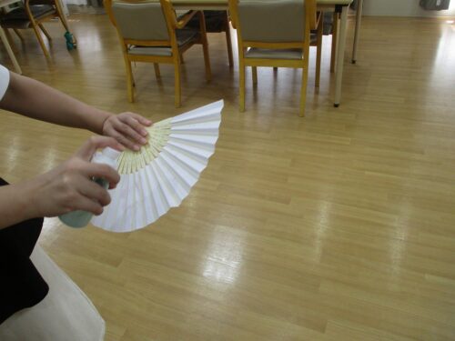 出来上がった扇子に、お好きな香りのアロマを振りかけて完成です。