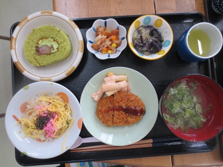 ロールケーキ・ちらし寿司・天ぷらのサラダ・茄子のそぼろ煮💛