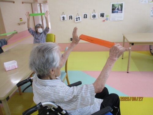 ショートステイではちまきを使って職員に合わせて体操をしました。