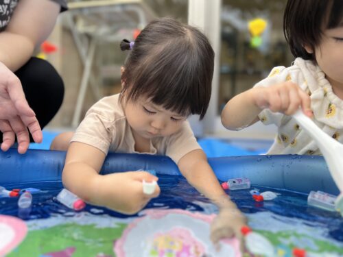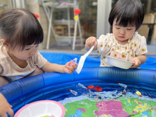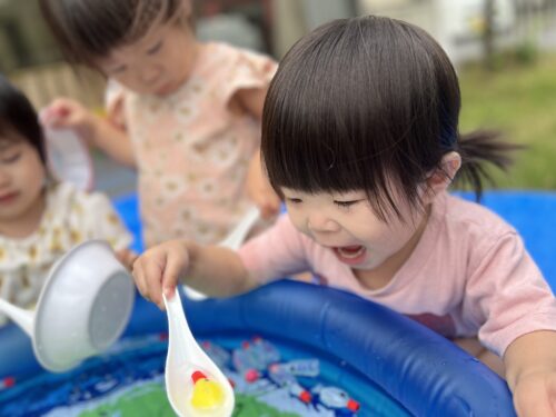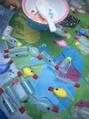 ぺんぎん🐧ぐみさんは、醤油さしでつくったお魚をれんげですくって魚釣りをしました😊