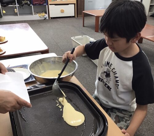 まずはホットプレートを温めて、ホットケーキの生地を細長くプレートの上に流します。