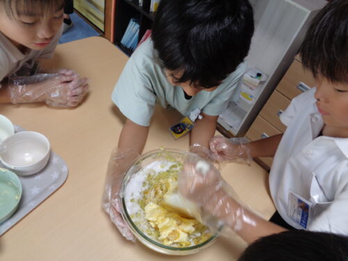 みんなで順番に混ぜてスイートポテトの下準備😊