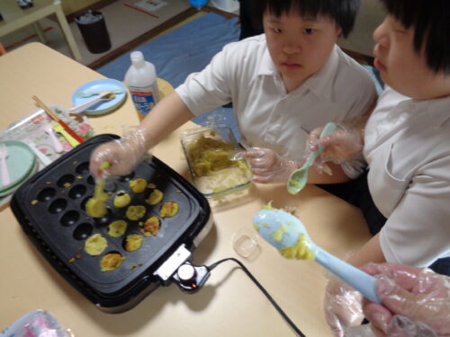 最後はなんと‼たこ焼きプレートで生地を焼いて